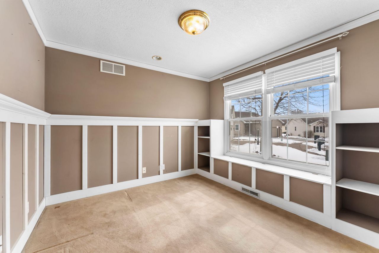 Delightful home located at the end of a quiet cul-de-sac and close to schools. This bright and cheery property features a kitchen with white cabinetry and abundant natural light. The main floor includes a great room with a gas fireplace--where the piano can remain at the buyer's request--as well as two bedrooms and a dedicated office. The primary bedroom offers a walk-in closet and an attached bathroom. The finished lower level provides a spacious recreation and family room, perfect for hobbies or entertaining, along with two additional bedrooms. Outside, you will find a walk-out deck, a fenced yard with mature landscaping, and a storage shed. Additional features include: whole-house speaker system, wired security system and ample storage throughout.